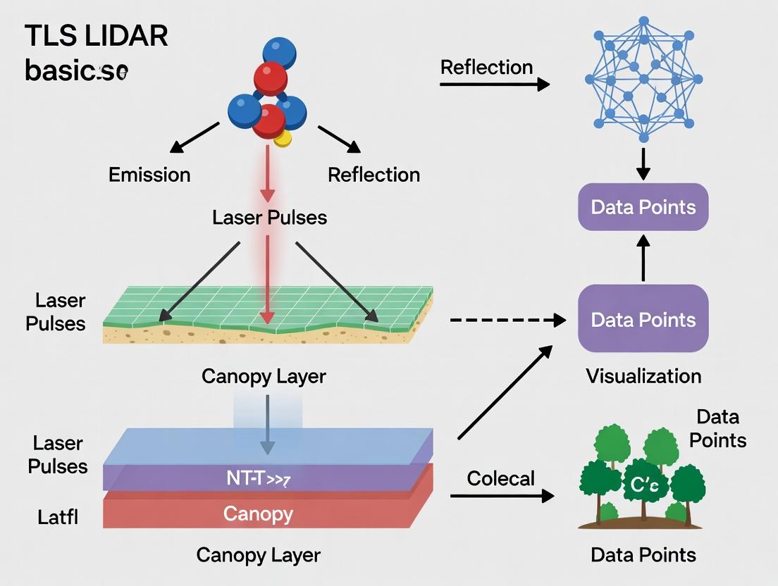 TLS operates on the principle of Time-of-Flight or phase-shift measurement, emitting laser pulses and calculating distance based on the return time. It generates dense point clouds (thousands of points/m²) from fixed tripod positions. Key ecological applications include: